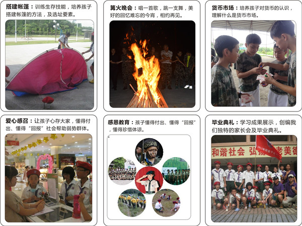 活動(dòng)形式:童軍特訓(xùn)營(yíng)以學(xué)生的成長(zhǎng)過(guò)程為主線,以過(guò)去——現(xiàn)在——未來(lái)為導(dǎo)線展開(kāi)培訓(xùn)。通過(guò)了解過(guò)去的我是一個(gè)什么樣的,在過(guò)去我形成了一些什么特質(zhì),有哪些優(yōu)點(diǎn),有哪些需要提升的地方,有哪些限制自己成長(zhǎng)的鐵鏈,接納自己的過(guò)去,有利于自己的全面成長(zhǎng)。然后現(xiàn)在讓孩子成為一個(gè)個(gè)性鮮明、充滿自信、敢于負(fù)責(zé),具有思想力、領(lǐng)導(dǎo)力、創(chuàng)造力的現(xiàn)代學(xué)生,提升孩子的交際溝通能力,為自己將來(lái)設(shè)定切實(shí)可行的目標(biāo)及方向。